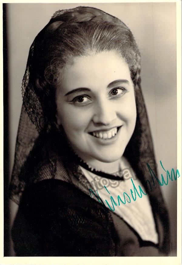 Signed photo postcard, shown as Micaela in Carmen. Size is 4 x 5.75 inches.
