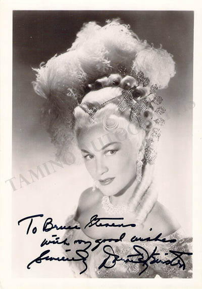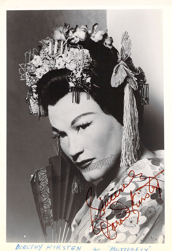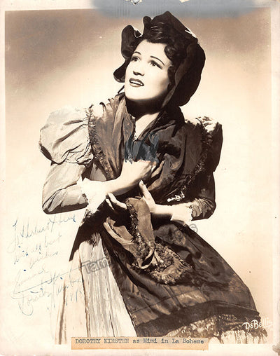 Signed photograph, shown as Mimi in Puccini's La Boheme, inscribed and dated in 1948. Printed signature on front of photographer De Bellis, New York. Size is 8 x 10 inches, several creases along with small cuts at the top, priced accordingly.