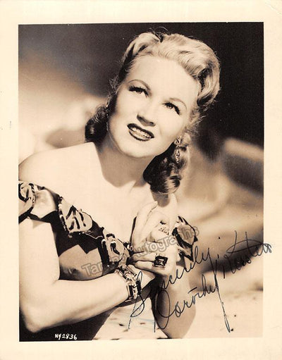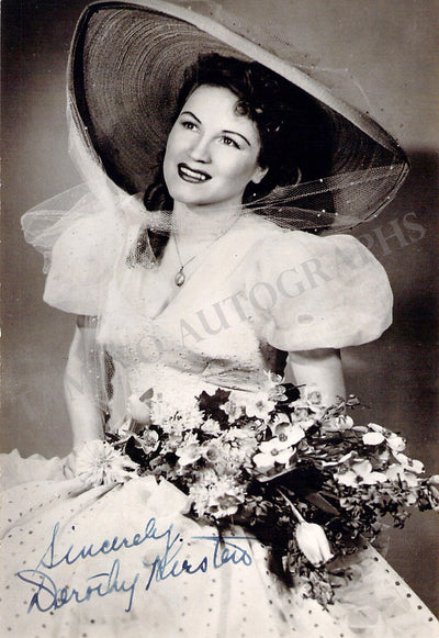Beautiful black-and-white photo postcard signed by her with a short sentiment, shown in role. Size is 3.5 x 5.1 inches, in excellent condition.