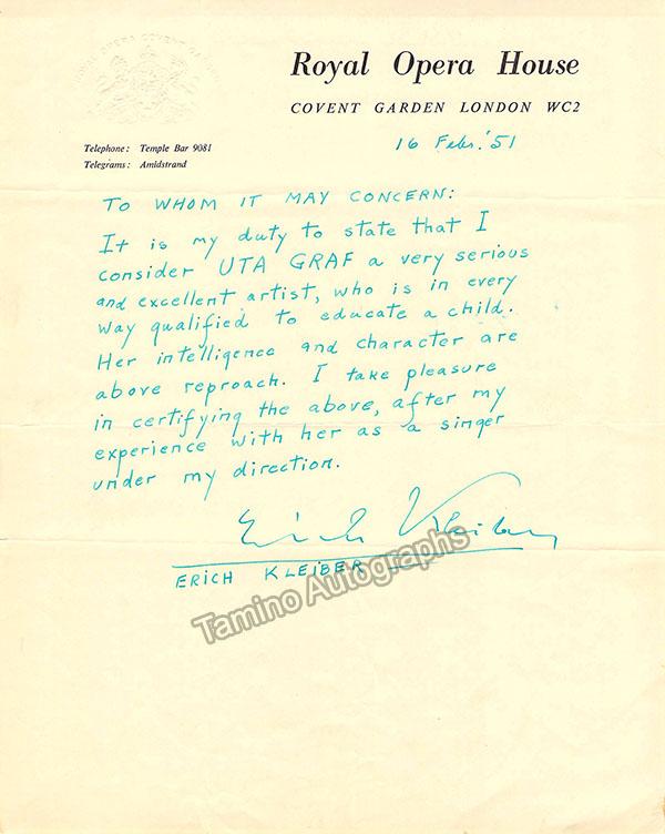 Austrian conductor (1890-1956) and composer, father of the widely acclaimed also conductor Carlos Kleiber.  Autograph letter signed with the Royal Opera House London letterhead, written in English, recommending someone. Size is 8 x 10 inches, 1 page, folds, in very good condition.