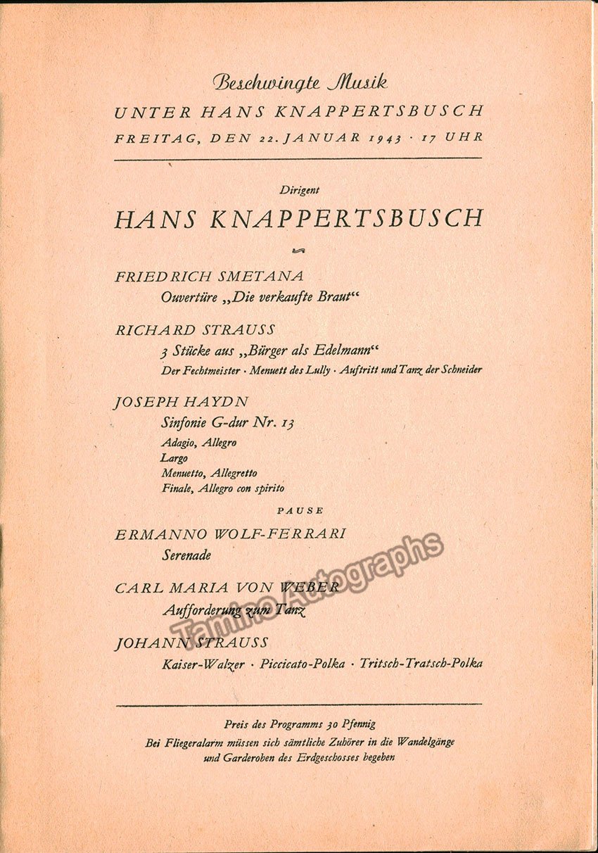 Hans Knappertsbusch conducts Berlin Philharmonic Orchestra. Berlin, Philharmonie. January 22, 1943. Concert with ‘light’ music : Smetana, Richard Strauss, Haydn, Wolff-Ferrari, Weber, Johann Strauss. Complete program booklet. Rare item from the Berlin Philharmonic Orchestra during WWII.