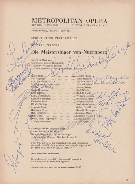 Cast page from a performance of Wagner's Die Meistersinger von Nuernberg at the Metropolitan Opera, New York1969, signed by the artists. Size is 8 x 11 inches (20 x 27.5 cm).