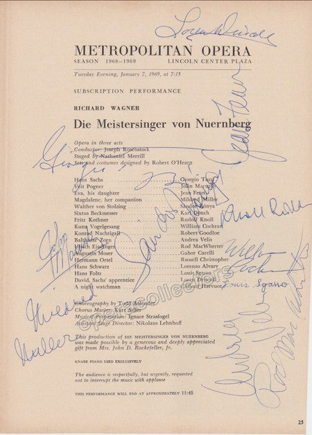 Die Meistersinger von Nuernberg, Met Opera, Jan. 7th 1969, signed cast page (not full program), 8 x 11 inches (20 x 27.5 cm)