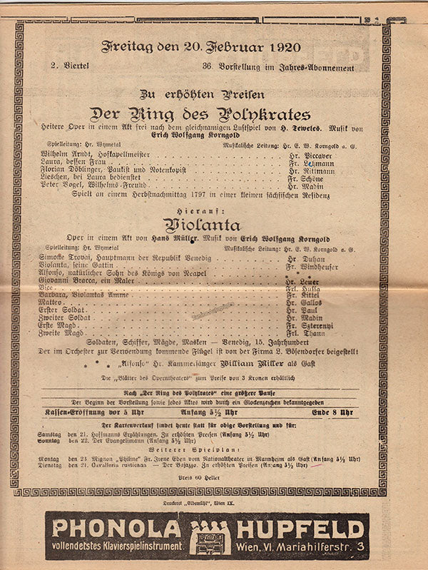 Austro-Hungarian-born American composer (1897-1957), unsigned program of him conducting two of his operas which were frequently paired together, "Der Ring des Polykrates" and "Violanta", and which both premiered on a double bill in Munich in 1916. This performance took place in Vienna on Feb 20, 1920 and is a full program book containing all pages and covers. Each page is 5.5 x 8.75 inches, well preserved vintage item in excellent condition!