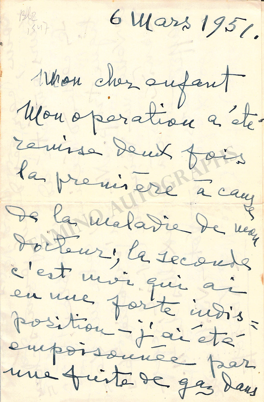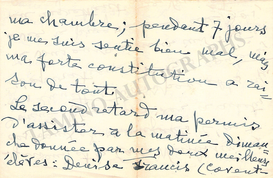 Italian-born soprano (1876-1955). Autograph letter signed, 4 pages of text on a folded document, dated in 1951, written in French, sold untranslated. Size of each unfolded page is 5.25 x 8.25 inches, in very good condition.