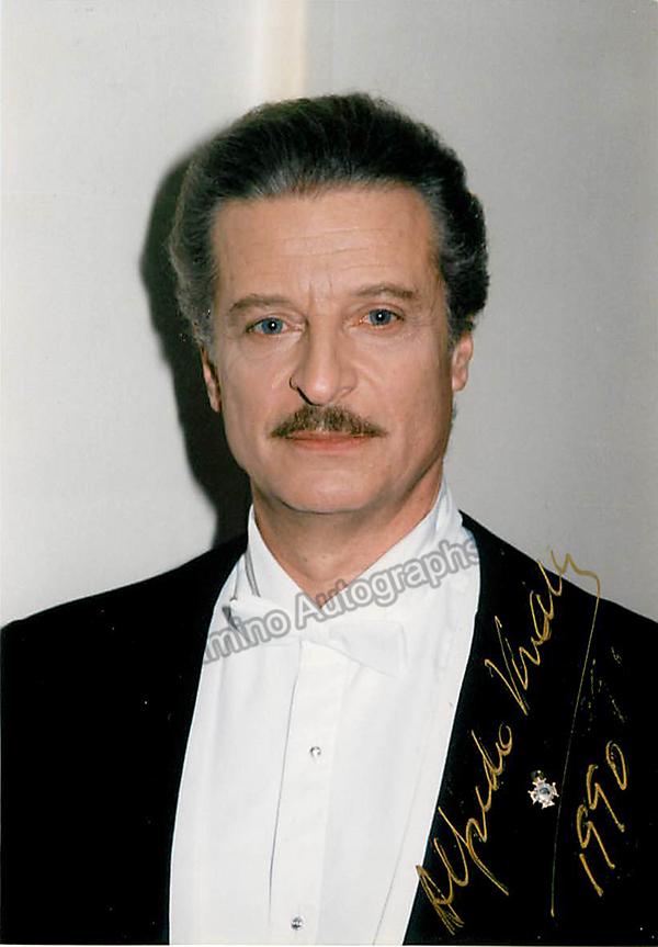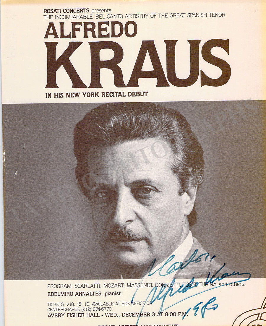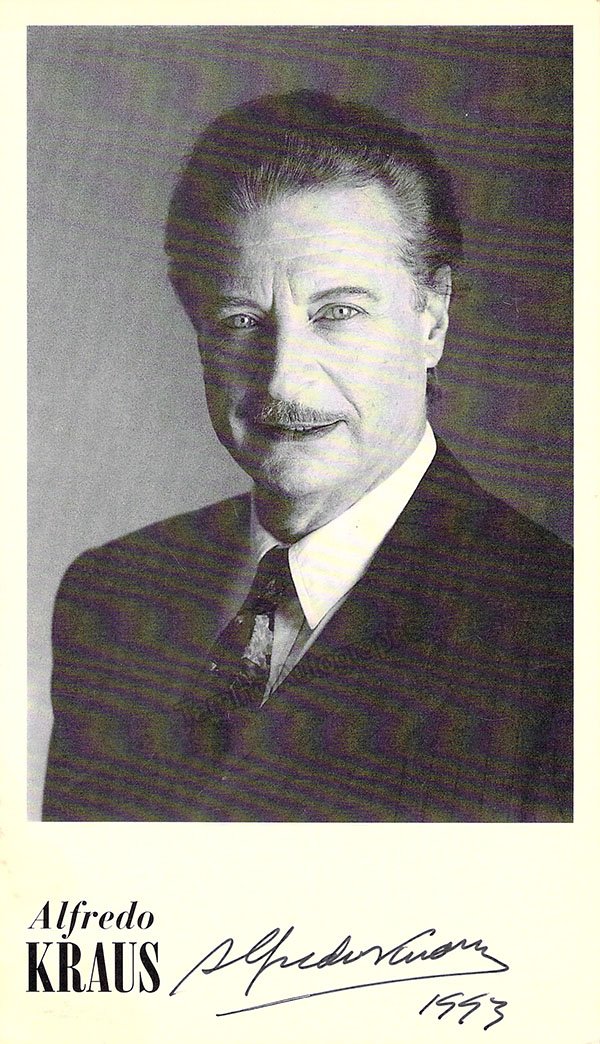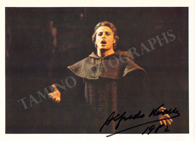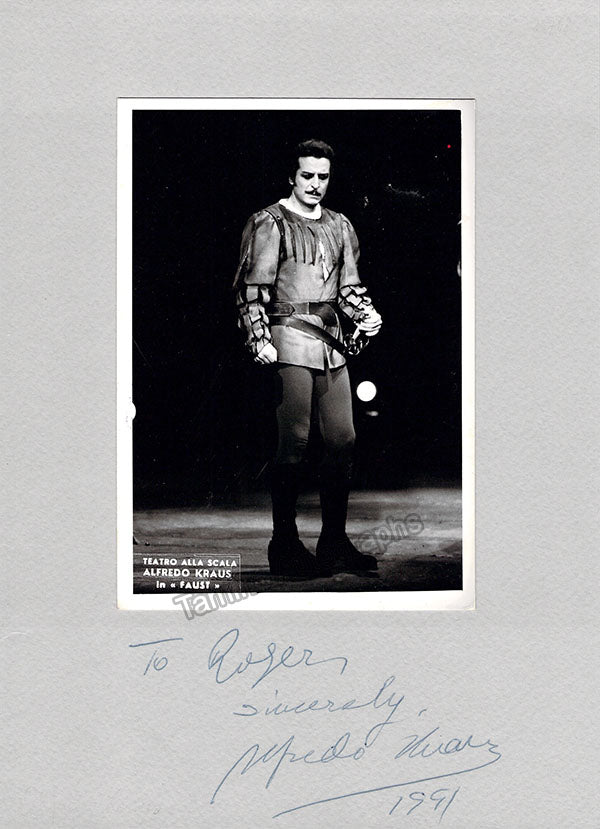 Signed photograph, shown in the title role of Gounod's Faust, inscribed and dated in 1991. Photo size is 4 x 5.75 inches, mounted on soft cardboard (signature on cardboard), total item size is 7 x 9.5 inches, in excellent condition.