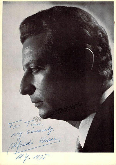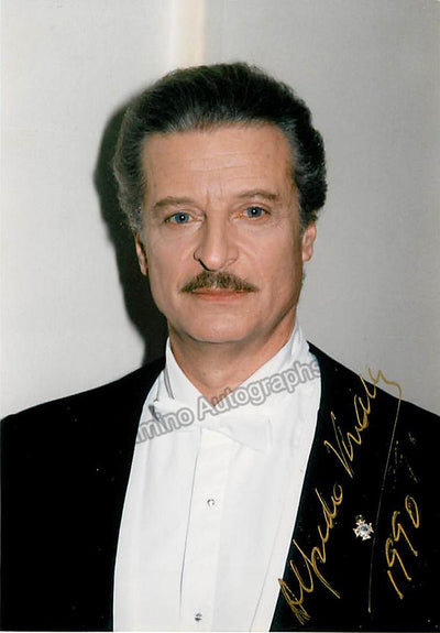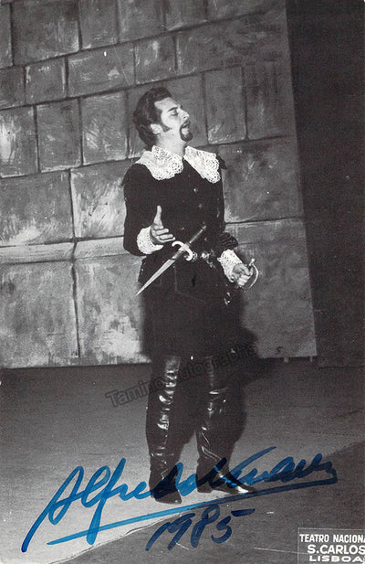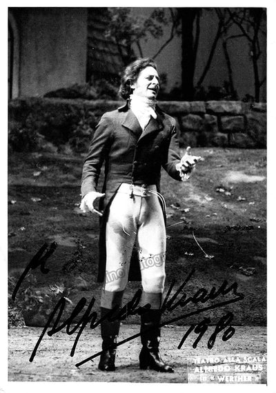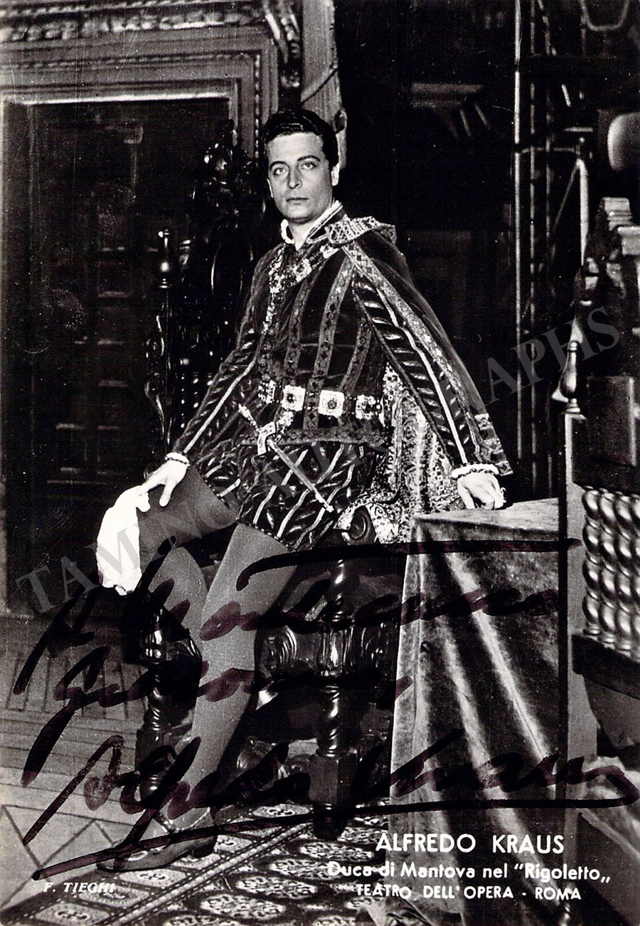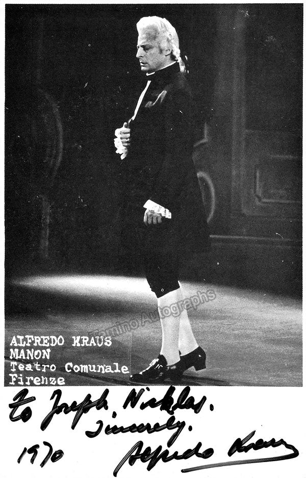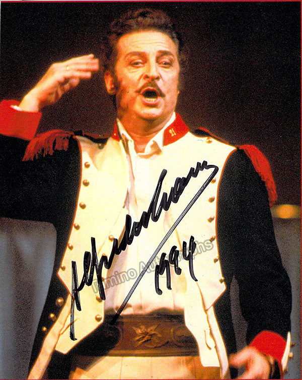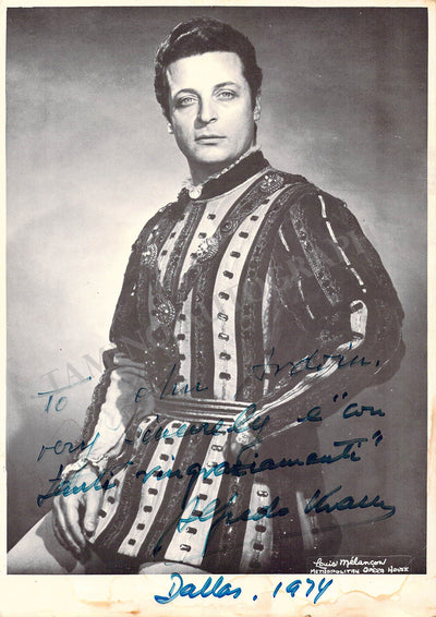 Signed photograph, shown as the Duke of Mantua in Verdi's Rigoletto, inscribed in Dallas, dated in 1974. Photo by Louis Melancon, Metropolitan Opera, New York. Size is 7 x 9.75 inches, some small stains and scotch tape residue underneath the photo but not affecting the image and signature. Otherwise in very good condition.