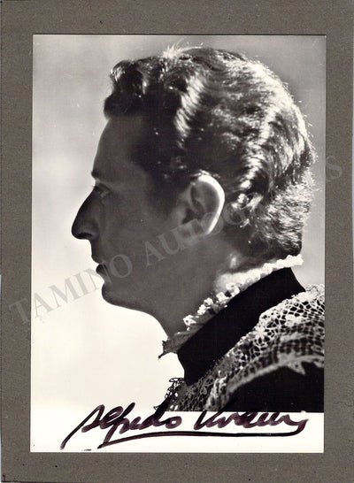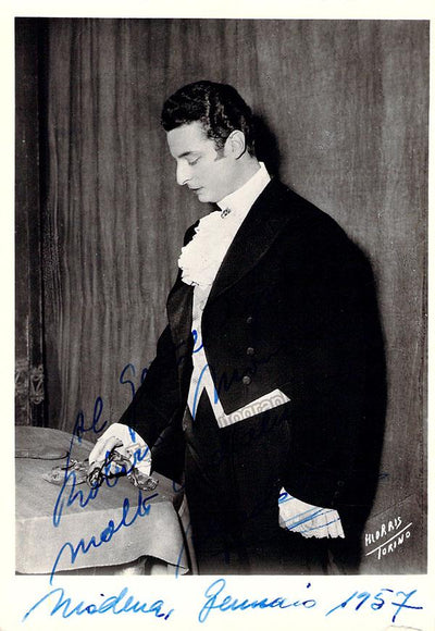 Fine black-and-white photograph signed by him with a short sentiment, shown backstage as the Duke in Verdi's 'Rigoletto' at the Rome Opera. Size is 3.9 x 5.7 inches, in excellent condition.