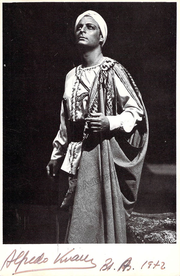 Fine black-and-white photograph signed by the tenor, shown in role, mounted on cardboard. Total size is 4.9 x 6.6 inches, in very good condition.