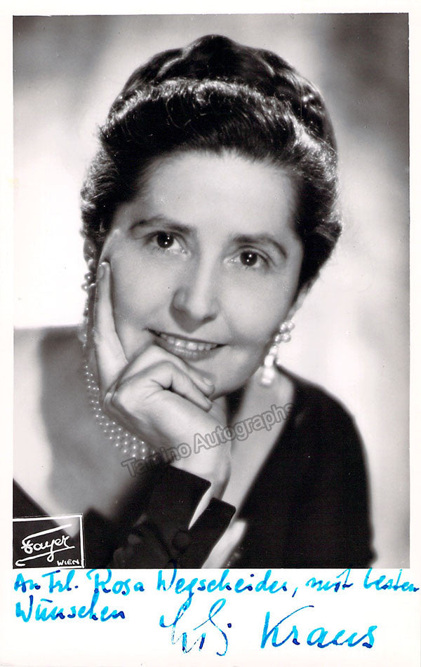 Beautiful black and white photo postcard signed and inscribed by her in German; stamped on verso by photographer Fayer, Vienna. Size is 3.5 x 5.5 inches, in excellent condition.