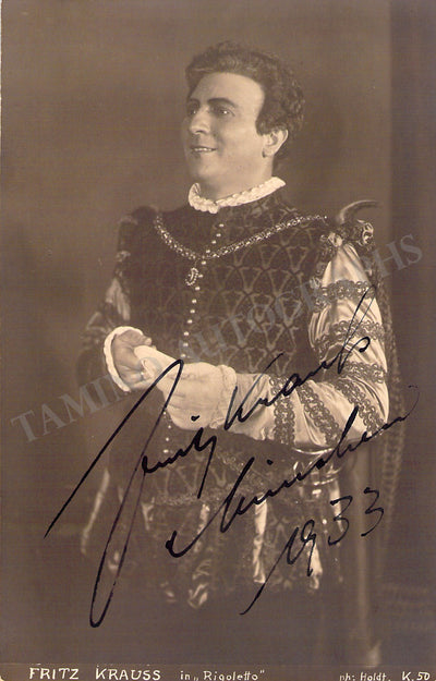 Signed postcard photograph, shown as the Duke in Verdi's Rigoletto, dated in 1933. Photo by Holdt. Size is 3.5 x 5.5 inches, in excellent condition.