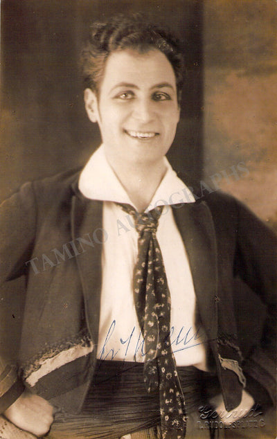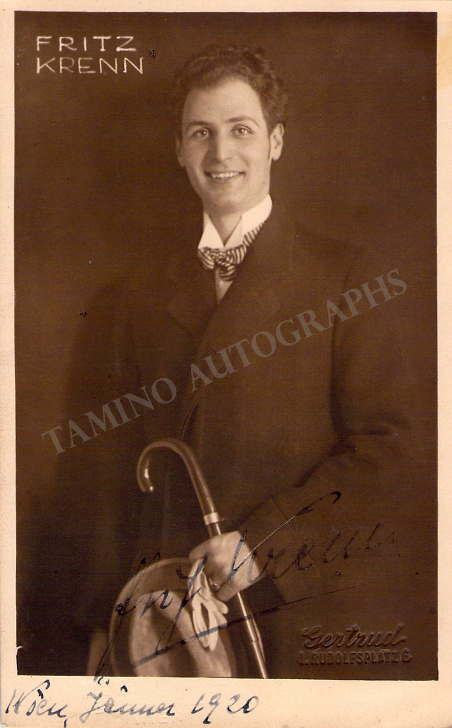 Signed postcard photograph, shown as himself, dated in Vienna in 1920. Blind stamped on front by photographer Gertrud and Magasin Metropole photo studio, Vienna. Size is 3.25 x 5.25 inches, in excellent condition.