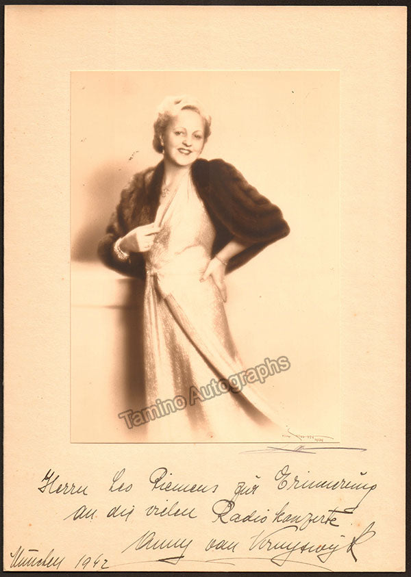 Signed photograph, shown as herself, inscribed, dated in Munich in 1942. Bold handwriting and signature. The photo size is 6.5 x 9 inches and is mounted onto a larger cardboard folder of 9.5 x 13.5 inches put together by the photographer A. Sahm, Munich (whose printed signature is on the front side of the photo, Kruyswyck's signature and inscription is on the third page of this four page folder directly underneath the photo). Vintage item in excellent condition.
