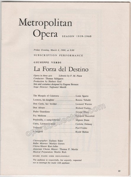 Full Metropolitan Opera program for a performance of La Forza del Destino, the tragic night of March 4th, 1960 in which Leonard Warren died at age 48 on stage of a massive stroke (after completing Don Carlo´s Act III aria "Morir, tremenda cosa"). Unsigned, full program for that night, with all pages and covers, in excellent condition