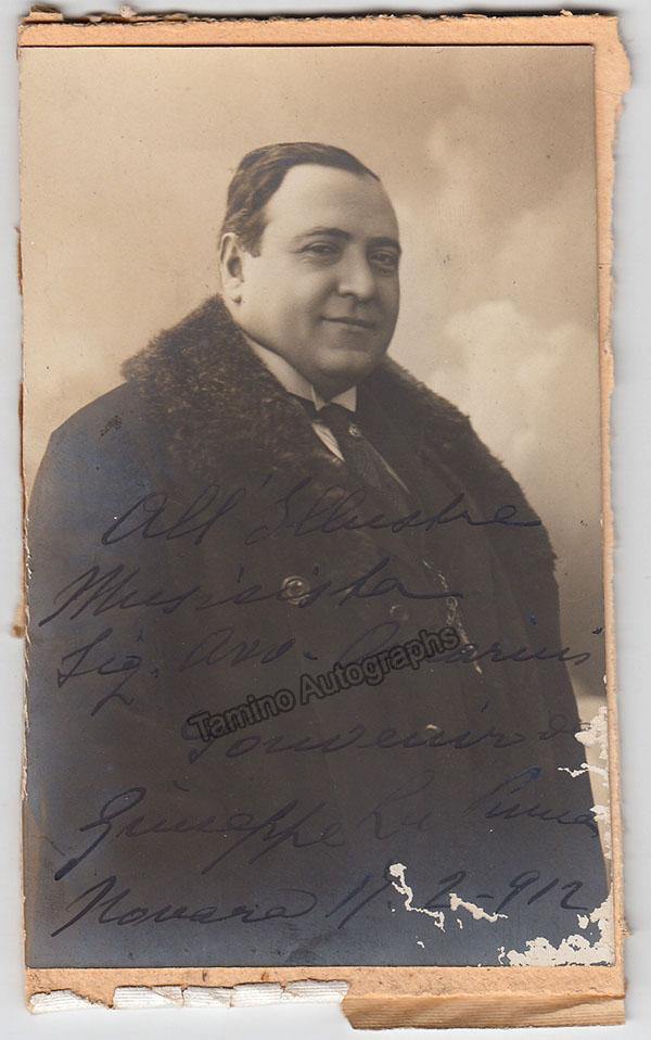 Italian baritone (1870-1940), active from the 1890s to the 1930s. Signed photograph, shown as himself, inscribed with sentiment, dated in Novara in 1912. 3.5 x 5.25 photograph mounted onto small piece of cardboard, total item size is 3.5 x 5.75 inches, some paper loss on right not affecting the signature or inscribed text, discount reflected in price.