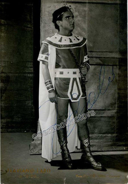 Italian tenor (1927-1991) particularly associated with heroic roles of the Italian repertory. Labò was admired for his robust, typically Italianate voice, and his direct unaffected manner. His last performance was in Turin, as Ismaele in Nabucco, in 1987. Here shown as Radames in Aida by Verdi, 4 x 6 inches.