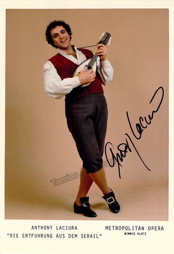 American character tenor and later television actor (b. 1951), signed photograph, shown as Pedrillo in role in Mozart's Entfuhrung aus dem Serail. Photo by Winnie Klotz, Metropolitan Opera, New York. Size is 5 x 7.25 inches, in excellent condition.