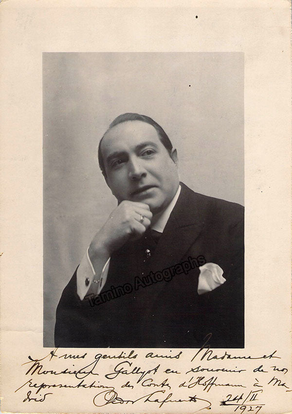 Spanish tenor (1891-?), signed photograph, shown as himself. Inscribed and dated in 1927. Size is 6.25 x 8.5 inches, small creases and bends and mounting traces on verso, otherwise in good condition.
