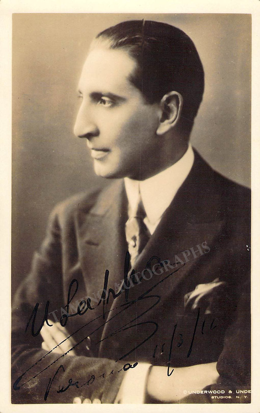 Greek tenor (1888-1971), signed postcard photograph, shown as himself, dated in 1916. Photo by Underwood and Underwood photo studio, New York. Size is 3.5 x 5.5 inches, in excellent condition.