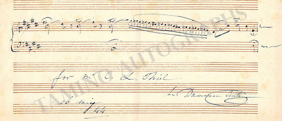 Short autograph music quote (probably a personal cadenza) signed and inscribed by her and dated 1844. Size is 8.3 x 3.6 inches, crack over the left border, minor stains, otherwise in excellent condition.