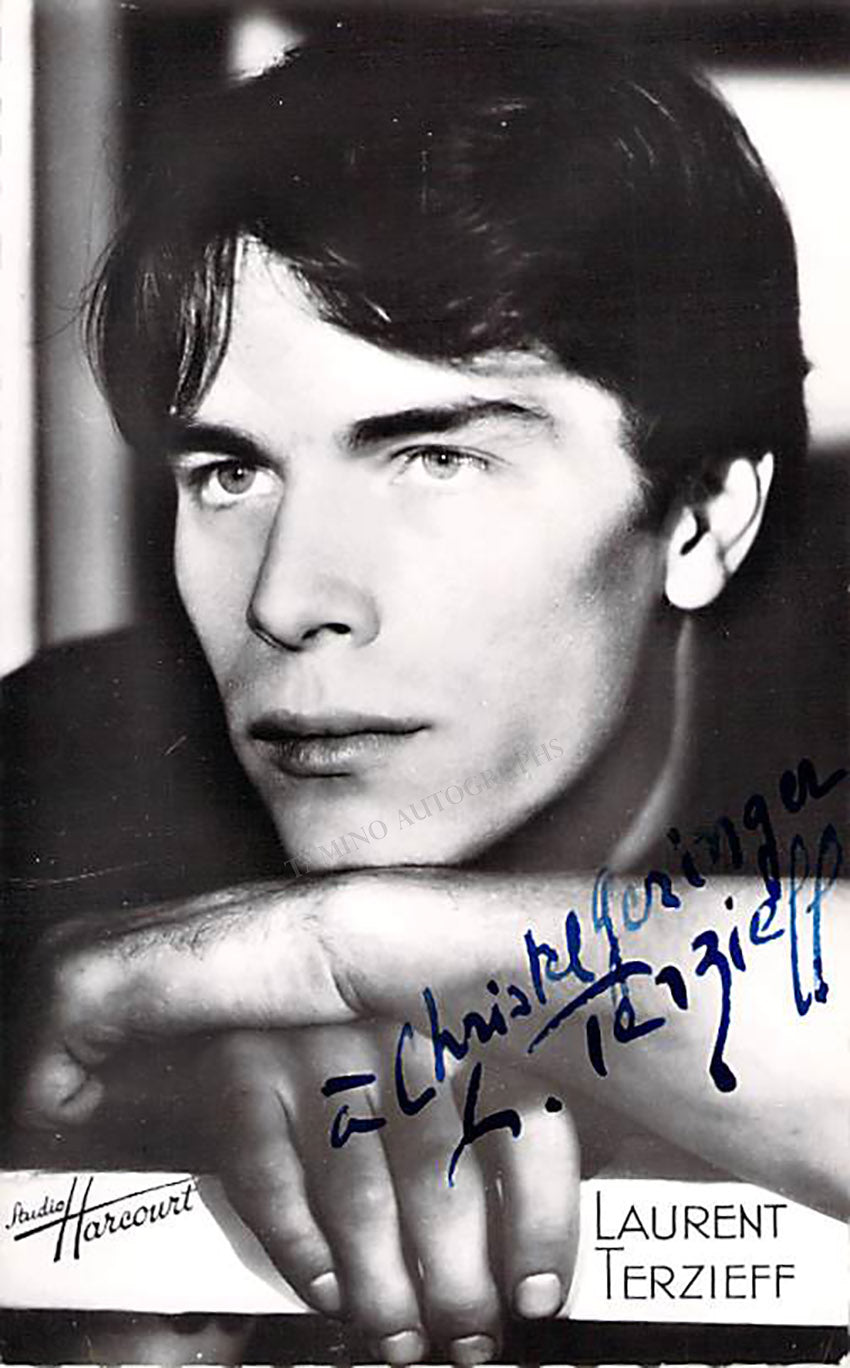 Fine black-and-white promo photo postcard by Studios Harcourt signed and inscribed by the actor. Size is 3.3 x 5.5 inches, jagged edges, in overall excellent condition.