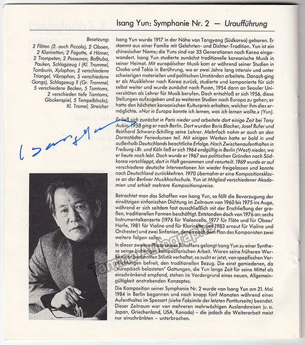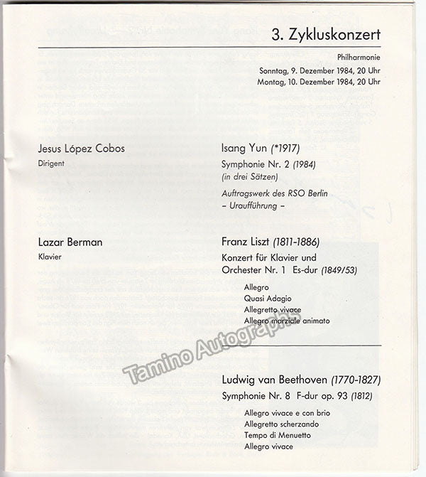 Program for a performance of Franz Liszt's Piano Concerto No.1 by the celebrated Russian pianist with the Radio-Symphonie-Orchester Berlin conducted by Lopez-Cobos, signed by both artists in their corresponding bio pages, and also signed by the Korean-born German composer Isang Yung.