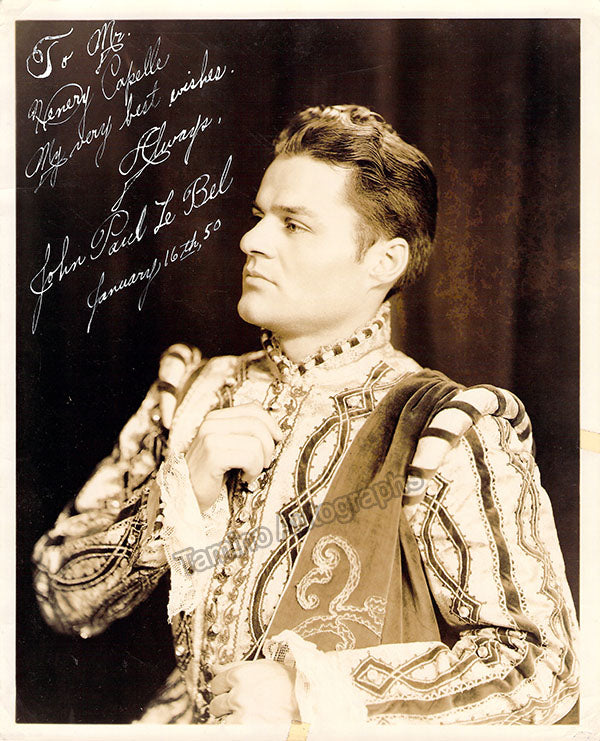 American tenor and inventor (1921-2006), active with the Michigan Grand Opera company, also appeared on radio and films. Signed photograph, shown in role, inscribed in 1950. Bold handwriting and signature. Stamped on verso by photographer John Karalis, Detroit. Size is 8 x 10 inches, small creases and folds, otherwise in very good condition.