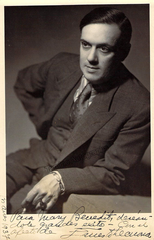 Set of 1 4.5 x 7 inch signed photograph, inscribed with sentiment, dated in Buenos Aires in 1937, stamped on verso by photographer Annemarie Heinrch, Buenos Aires, some bends but in otherwise very good condition, along with an autographed musical quote from Malagueña, dated in Hollywood in 1946, 3.5 x 9.5 inches, in excellent condition. Not sold separately.