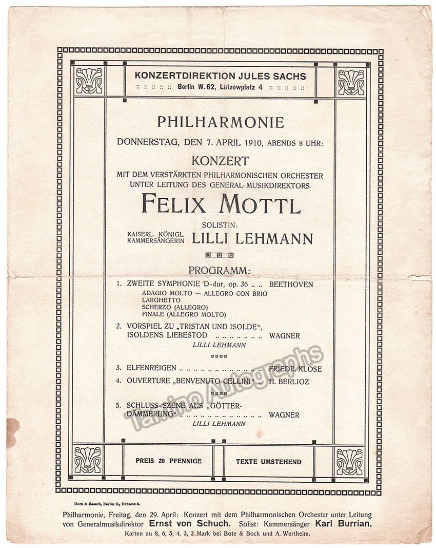 Felix Mottl & Lilli Lehmann Berlin, Philharmonie, 7. April 1910 Berliner Philharmonisches Orchester Conductor : Felix Mottl Soloist: Lilli Lehmann, Soprano Sinfonie Nr. 2 (Beethoven) Vorspiel und Liebestod aus Tristan und Isolde (Wagner) Elfenreigen (Klose) Ouverture Benvenuto Cellini (Berlioz) Schluss-Szene aus Gotterdammerung (Wagner). Program, 28 x 22,5 cm. 4 pages
