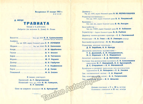 Signed photograph, shown as Alfredo in Verdi's La Traviata. Size is 4.25 x 6 inches, mounting traces on verso, otherwise in very good condition. ALSO INCLUDED: 4 page unsigned program of a1954 performance of this opera featuring the tenor at the Bolshoi Opera, Moscow. Size of each page is 5.75 x 8.25 inches, several creases and bends, otherwise in good condition. Not sold separately.