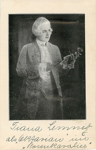 Signed half-tone photo of the German soprano (1897-1994) shown as Octavian in Strauss' Der Rosenkavalier. Size 3.5 x 5.5 inches.