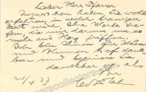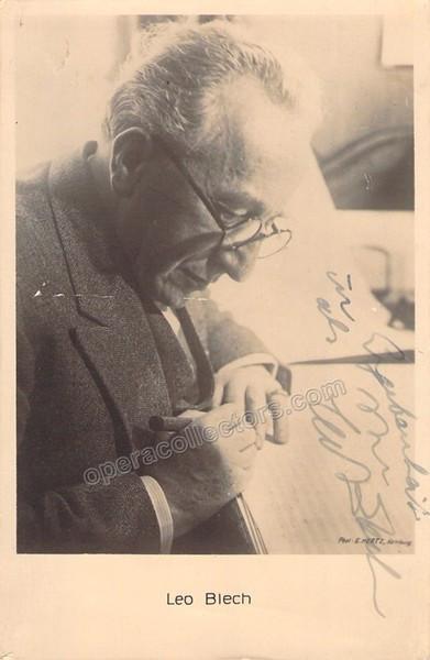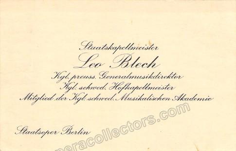 German opera conductor and composer (1871-1958), he was in charge of the (later) Berlin State Opera and other opera houses in Europe. Business card printed with his name, from the Staatsoper in Berlin (which he conducted from 1947 to 1953). This card is handwritten and signed by him on verso (see scan). Also included is a postcard photo of him, signed on the front with a short text ("in remembrance from"), handwritten by Blech on verso - all regarding personal matters