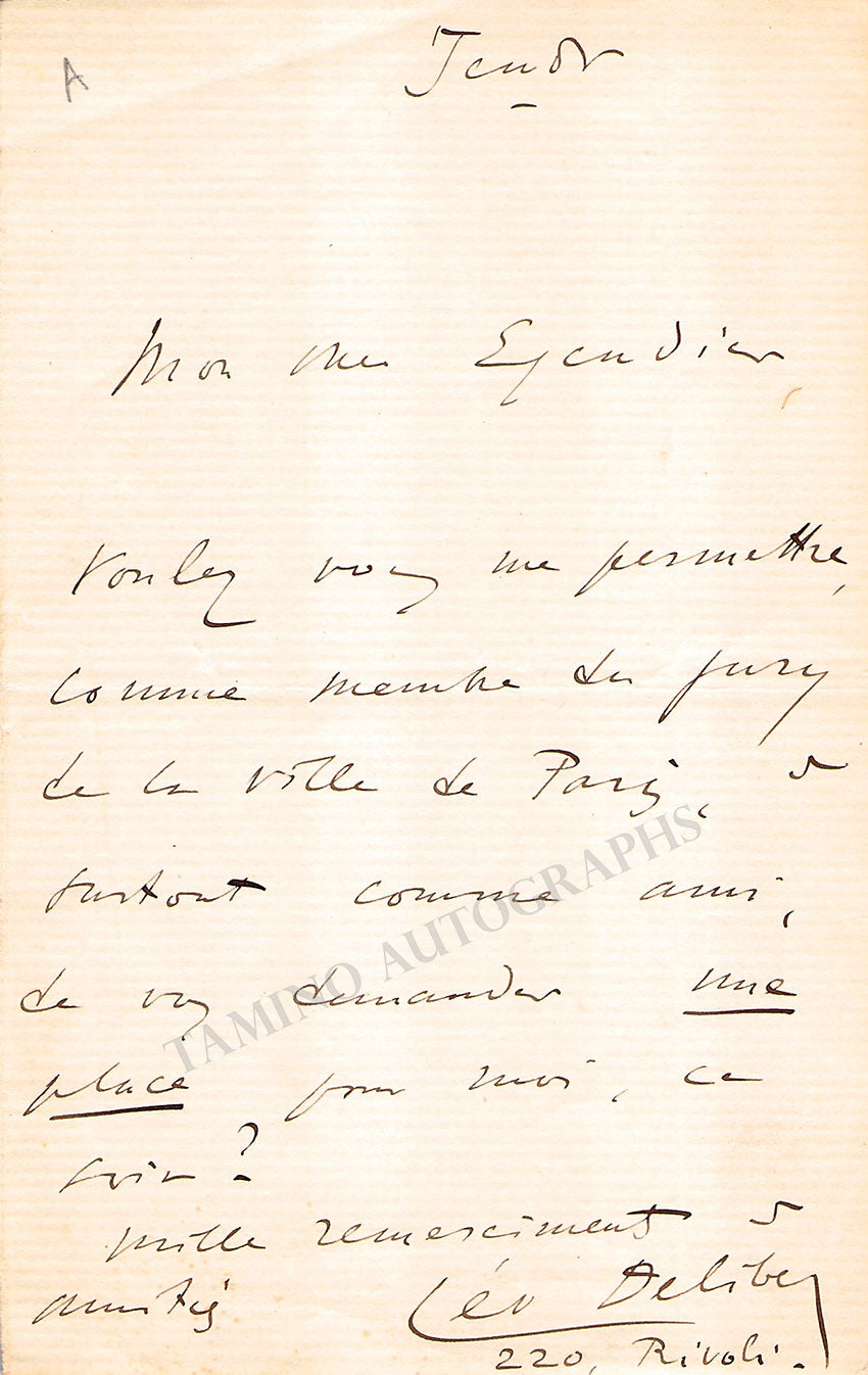 Autograph note in French (sold untranslated) signed by him -no date mentioned. Size is 4 x 6.5 inches, in excellent condition.