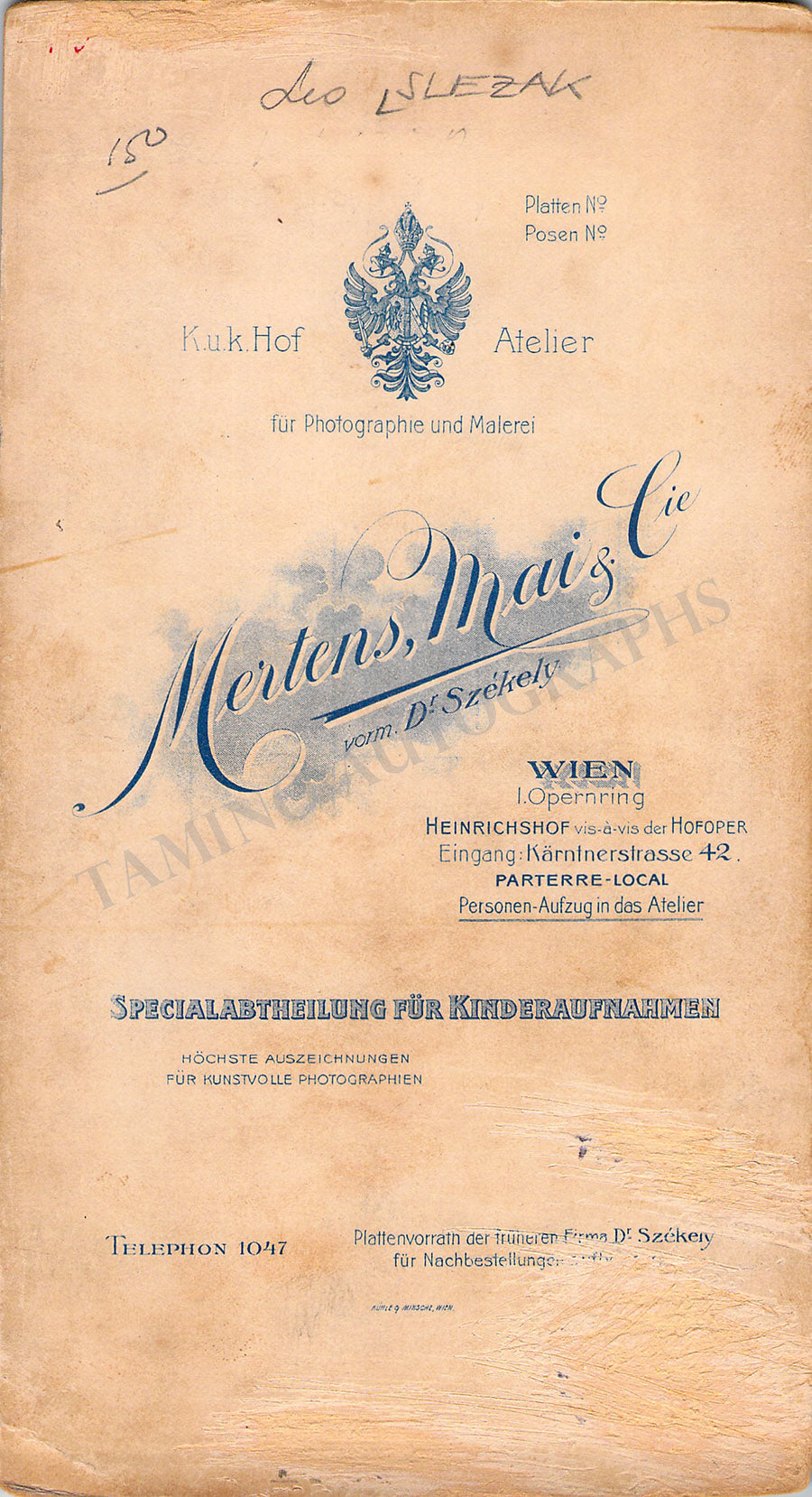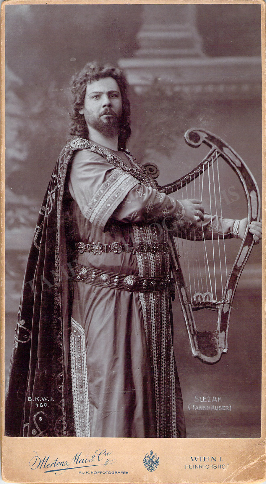 Beautiful vintage cabinet photograph of the tenor shown as Tannhäuser by Mertens, Mai & Co. (Vienna).  Size is 4.4 x 8.2 inches, some scratches on the verso, minor damage over the lower-left corner, in overall very good condition.
