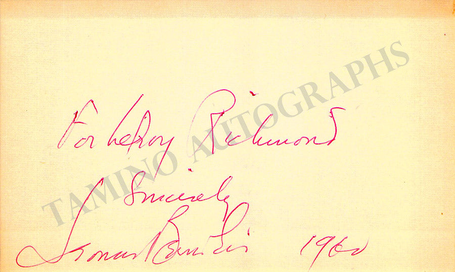 Card signed by Bernstein himself and inscribed to L. Richmond, 1960. Size is 5 x 3 inches, in excellent condition.