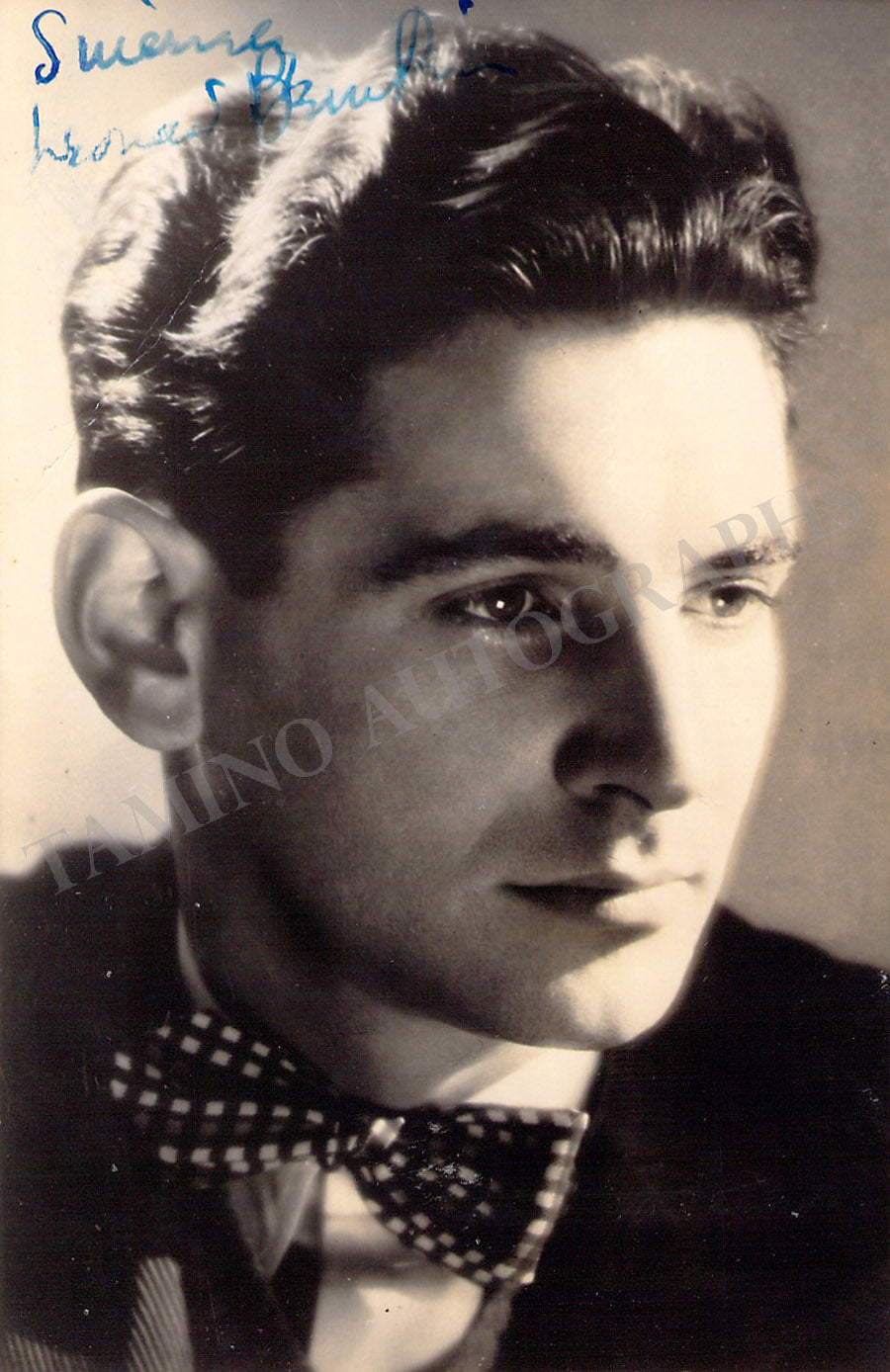 Black-and-white photo postcard signed by him with a short sentiment, shown very young. Size is 3.5 x 5.4 inches, slight decoloration over ink, otherwise in excellent condition.