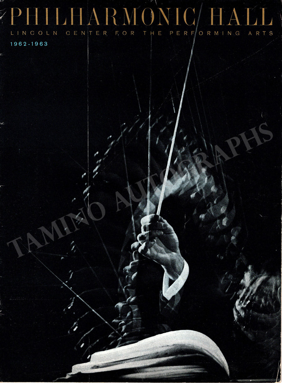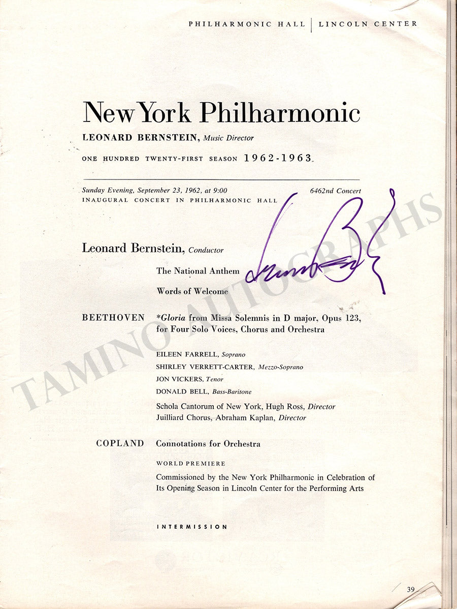 Original program for a performance of works by Beethoven, Mahler, Copland, and Vaughan Williams by the New York Philharmonic at the inauguration of the Philharmonic Hall, New York, on September 23rd, 1962, conducted by Leonard Bernstein and signed twice by him (on the program page and in an article).