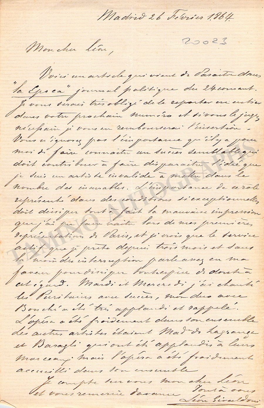 Autograph letter in Italian (sold untranslated) signed by him, dated in Madrid, February 27, 1864, to the music publisher Leone Escudier in Paris requesting the publication of an article in his magazine. Size is 5.25 x 8.2 inches, 1 page, in excellent condition.