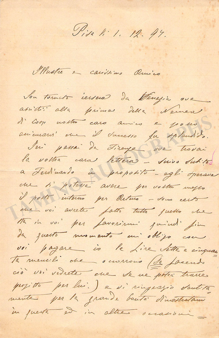 "... Yesterday evening I returned from Venice, where I attended the premiere of Nemea by [Ernesto] Coop, our dear friend, and I can assure you that the success was splendid. Yesterday I passed through Florence, where I found your dear letter – I am writing at once to Ferdinando on the subject – he hoped that through you we could have the internal place for Arturo – I am sure that you will have done everything in your power to favor me, so let it be from this moment on that I am obliged to pay with you the seven and fifty lire per month that are necessary (if in doing this you will see that it will be possible to profit by and I thank you sincerely for the great kindness shown to me on this and other occasions..."