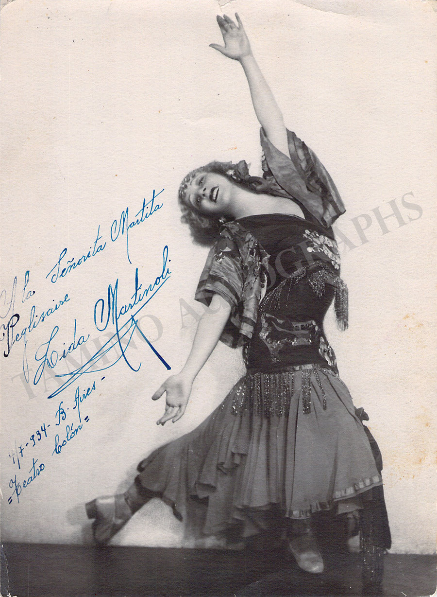 Black-and-white photograph signed and inscribed by her with a short sentiment dated 1934; ink-stamped on verso by photographer F. De Renoir. Size is 5 x 6.8 inches, some creases, in overall very good condition.