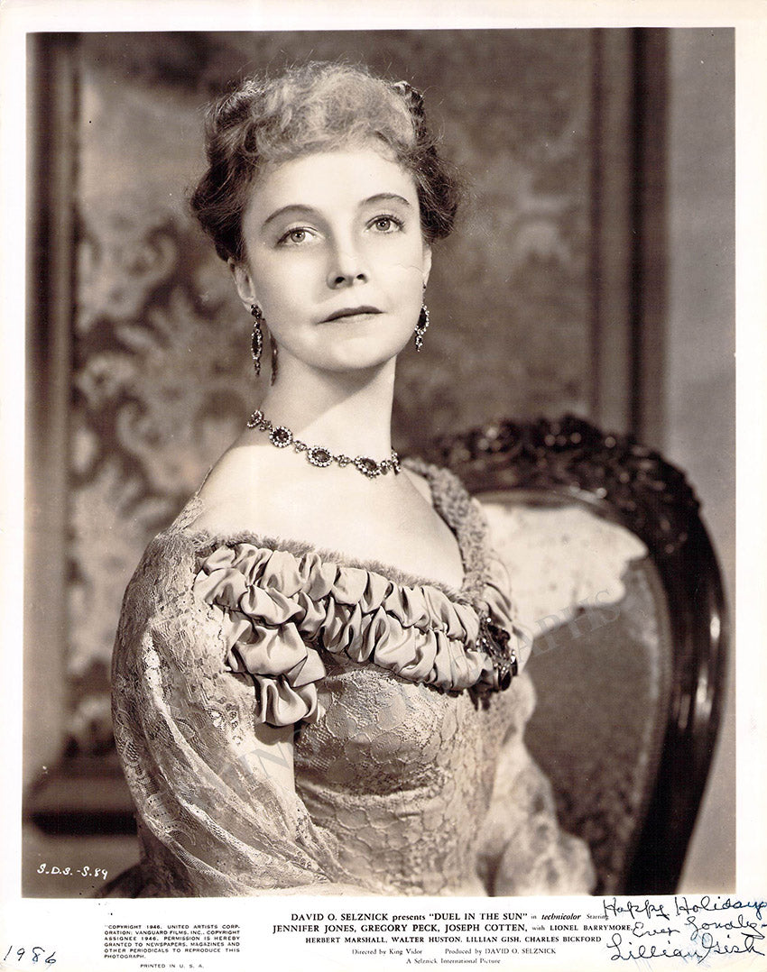 Fantastic promo movie-still photograph of the film Duel in the Sun signed by her with a short sentiment, dated by her in 1986. Size is 8 x 10.2 inches, minor creases, otherwise in very good condition.