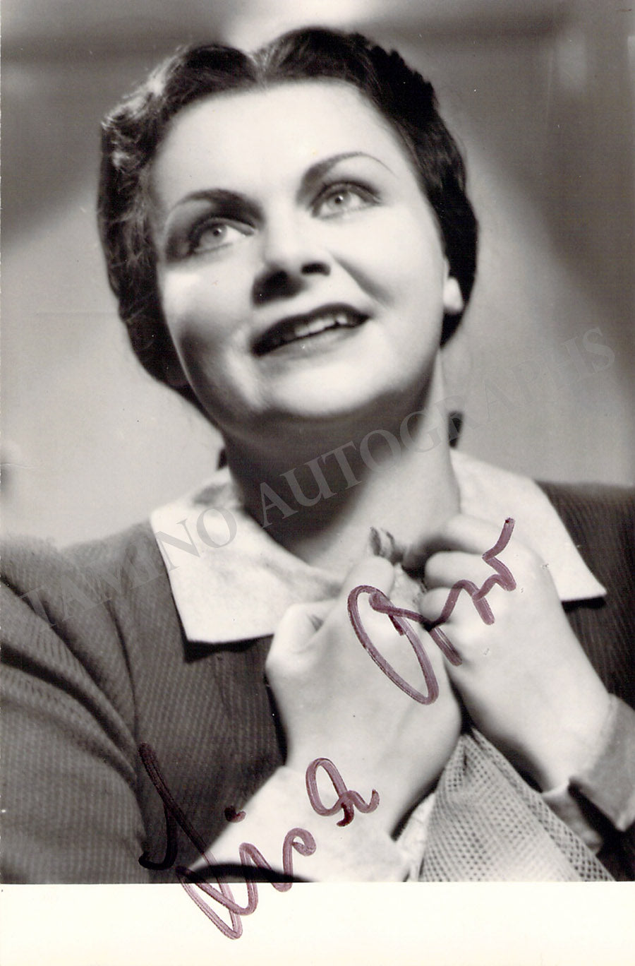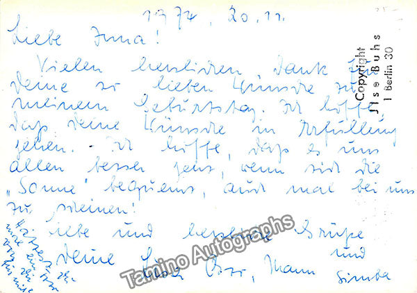 Fine black-and-white promo photograph signed by her with a long text in German on verso, dated 1974, shown as herself; ink-stamped on verso by photographer Ilse Buhs (Berlin). Size is 4 x 5.75 inches, in very good condition.