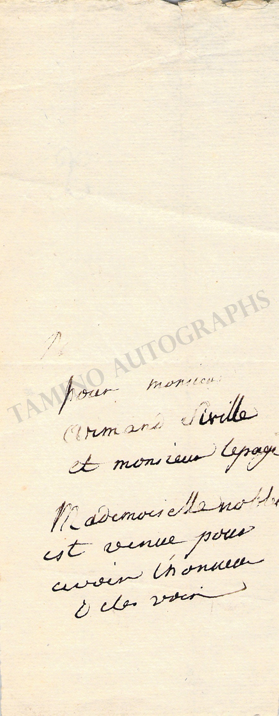 Autograph note in French by her, writing: "... for Mr. Armani Sirille and Mr. Lepage Mademoiselle Noblet came to have the honor.. of you...". Size is 2.9 x 7.5 inches, 1 page, folds, creases, some dirt, in overall very good condition.