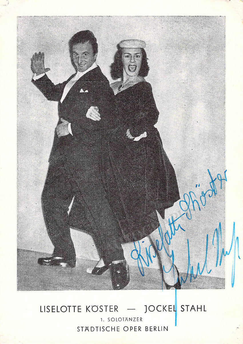 Beautiful black-and-white photo postcard signed by her, shown next to fellow dancer Jockel Stahl. Size is 4.9 x 5.9 inches, in excellent condition.