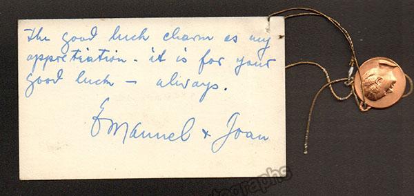 Austrian-American bass (1888-1967), signed and inscribed card with attached gold "Good Luck" coin given to American Mezzo Soprano Regina Resnik following one of her performances in Vienna, dated April 1961. Card is 2.5 x 4 inches, in excellent condition. Short sentiment on both sides of card, with very clear handwriting and signature (signed "Emanuel and Joan").