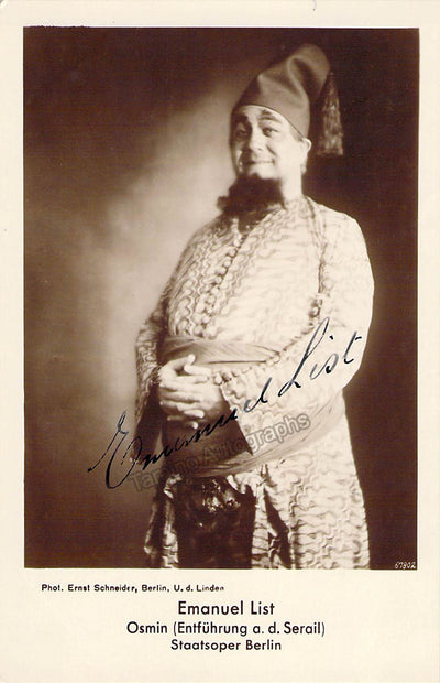 Signed postcard photograph, shown as Osmin in Mozart's Die Entfuhrung aus dem Serail, one of his most important roles. Photo by Ernst Schneider, Berlin. Size is 3.5 x 5.5 inches, in excellent condition.