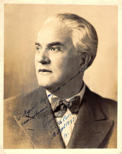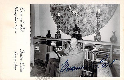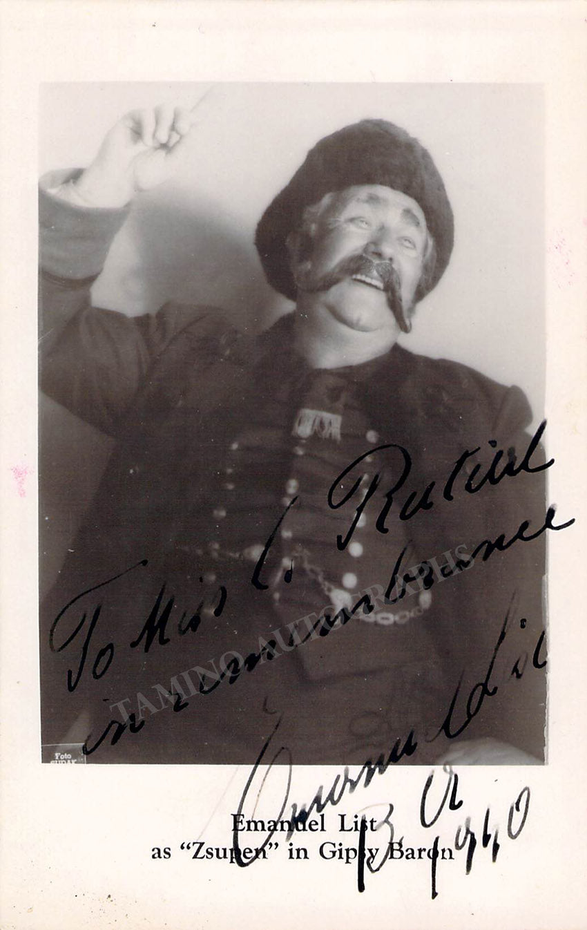 Signed postcard photograph, shown as Zsupen in Johan Strauss's Gypsy Baron, inscribed in Buenos Aires and dated in 1940. Photo by Sudak, Buenos Aires. Size is 3.5 x 5.5 inches, in very good condition.
