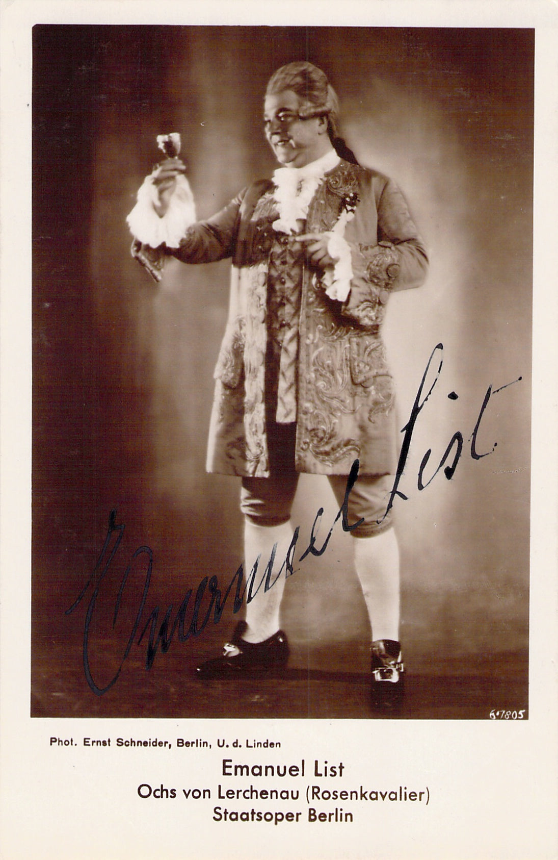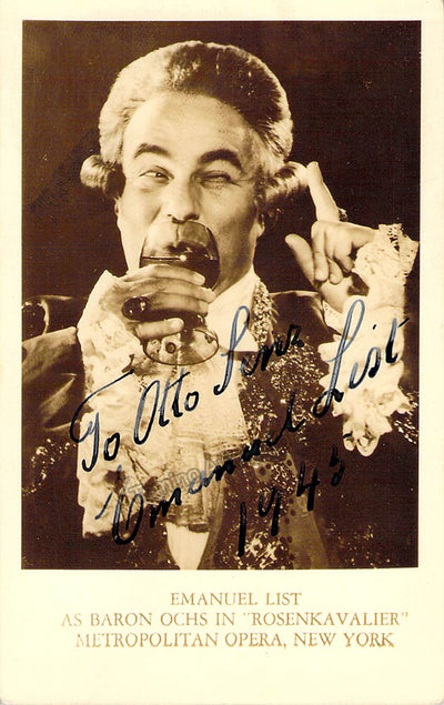 Signed postcard photograph, shown as Baron Ochs in Richard Strauss's Der Rosenkavalier, inscribed and dated in 1942. Size is 3.5 x 5.25 inches, mounting traces on verso, otherwise in excellent condition.