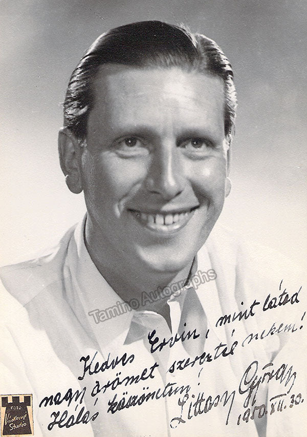 Hungarian bass (1912-1996), signed photograph, shown as himself, inscribed and dated in 1950. Stamped on verso by Varkonyi Laszlo photo studio, Budapest. Size is 4 x 5.75 inches, in excellent condition.