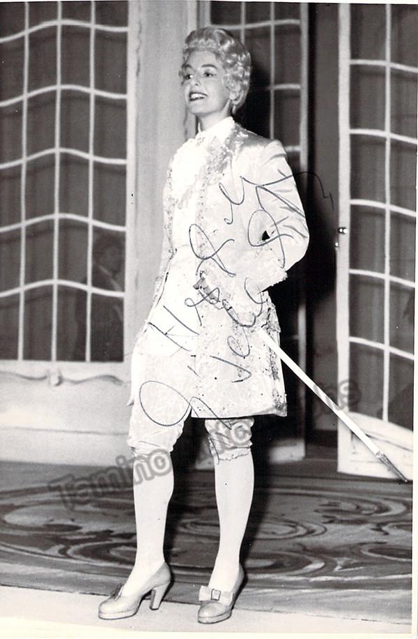 German contralto (b. 1922), signed photo, shown as Octavian in Der Rosenkavalier. Also handwritten on verso, stamped by photographer De Rota, Trieste. Size is 4 x 5.75 inches.